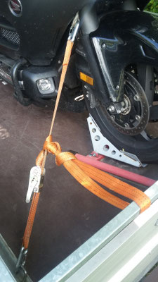 Aber wir sind da etwas vorsichtiger und sichern nun nochmal in der Mitte, je nach Möglichkeit. Jetzt reicht es aber wirklich. Es gibt inzwischen Systeme, die halten lediglich das Hinterrad auf dem Boden. Das mag transporttechnisch sicher und ausreichend sein, mich haben aber schon bei meiner Art die Heckbewegungen des Motorrades – bedingt durch die eigene Federung – gestört. Erstens irritiert das Geschaukel im Rückspiegel, zweitens kann so viel schwingende Masse auch nicht vorteilhaft sein. Also wird auch am Heck nochmal abgespannt. Dadurch muss evtl. in der Mitte nochmal nachgezogen werden, dann ist es aber gut und die Reise kann losgehen.