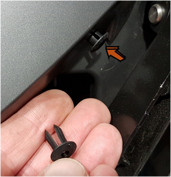 Man sieht jetzt die Abdeckung des Navi-Raums. Um an die unteren beiden Schrauben zu kommen muss einmal kurz die „Scheibe“ hochgefahren werden, dann geht´s leichter. Die Schrauben dienen zum Spreizen der schwarzen Stöpsel, die müssen also auch raus.