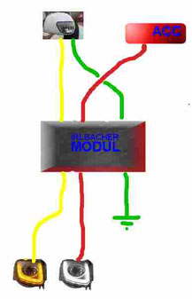 Es muss von den Blinkern jeweils ein Abzweig vom Masse- und Blinkerkabel zum Modul geführt werden, also Gelb bzw. Blau und Grün (Masse). Und – das Wichtigste - die Stromversorgung des Tagfahrlichts. Ich habe ein Kabel von ACC jeweils zu den weißen TFL- Anschlüssen gelegt.