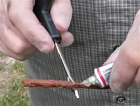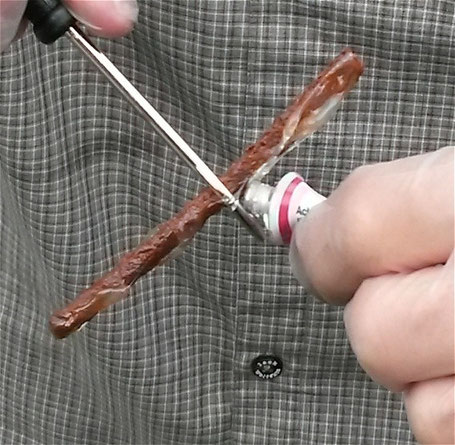 Es ist etwas fummelig die Ahle heraus, den Stoppen aber im Loch zu lassen. Mit ein wenig "Gefühl" geht´s aber, ehrlich.