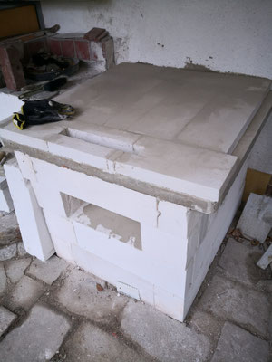 ... eine zusätzlichen Lage von Keramikwolle. Die selbst gemachte Vorstelltüre, mit Ascheloch.