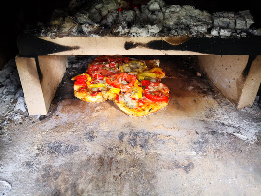 Um für 2 oder 3 Pizzen nicht die ganze Katakombe durchglühen zu müssen habe ich aus ein paar Schamotte-Steilen eine kleine Garfläche abgeteilt. Da passt eine große