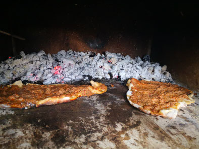 Belag mit einer Mischung aus Hack, div. Gewürzen, einer Sucuk, Tomaten usw.. Optisch keine Offenbarung, der Geschmack aber