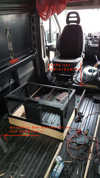 Auf keinem Foto mit Zwischenwand ist wirklich zu erkennen, dass es einen 15 cm Sockel zwischen Fahrerzelle und Laderaum gibt. Zusätzlich befindet sich im Bereich des Durchgangs eine 6 cm tiefe