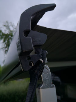 Somit konnte der Spannhaken nicht zur Seite rausrutschen, was jetzt passiert, wenn der Gurt nicht ganz im (fast) rechten Winkel zur Markise angeschlagen wird. Auch scheint der Haken nicht